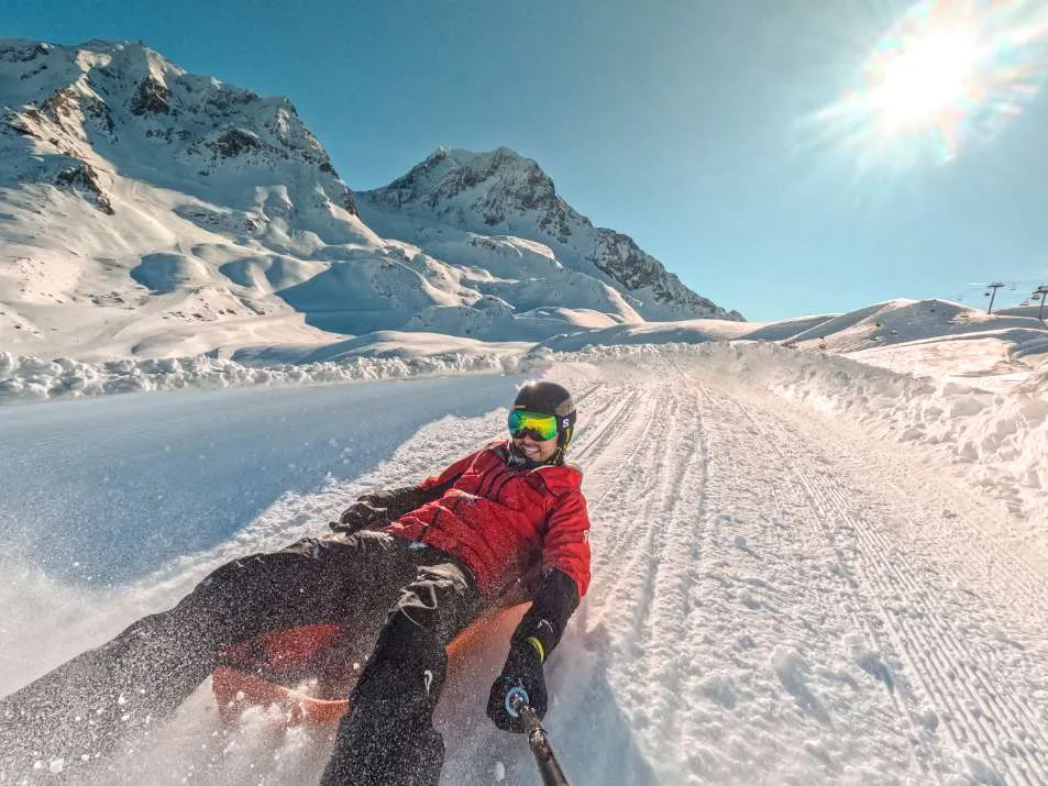 Nadat je sneeuw hebt gehapt, kun je de slee achterlaten bij één van de skiliften om vervolgens terug op je iets betrouwbaardere skilatten of snowboard naar beneden te scheuren.