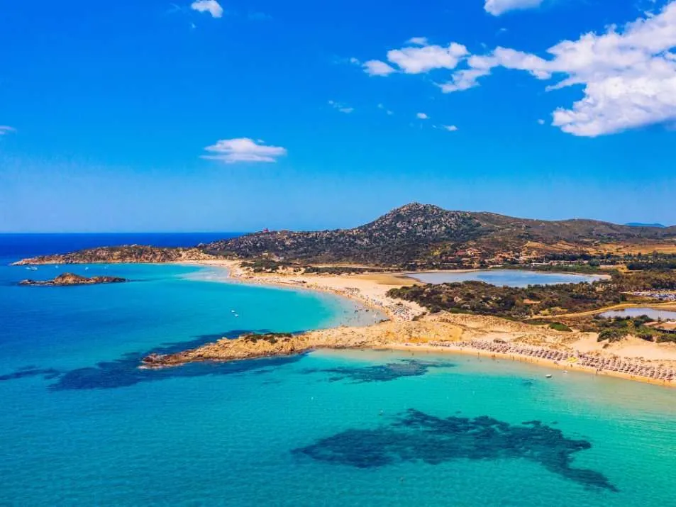 Simius Beach heeft een mooi wit strand aan een licht aflopende kust, met een geweldig uitzicht over de blauwe zee – dit strand is wel arm aan horecagelegenheden. Porto Giunco is een fijn zandstrand aan een grote baai en biedt heel veel ruimte; door de ondiepe zee is dit een aanrader voor toeristen met kinderen. En Spiaggia del Giunco o Notteri heeft een erg breed strand dat omsloten wordt door groen, de zee en een ondiepe lagune waarin je groepen flamingo’s hun voedsel op ziet scharrelen.