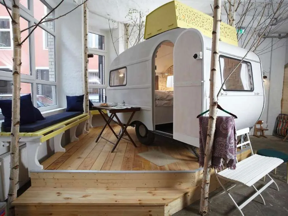 - De laatste van mijn hotel tips voor Berlijn is het geweldige Hüttenpalast in Kreuzkölln. De zalen van dit krankzinnige hotel staan vol met kleurige Volkswagenbusjes, ouderwetse caravannetjes en kleine blokhutten. Indoor outdoor kamperen dus – veel gekker wordt het niet dan bij dit unieke logeeradresje.
