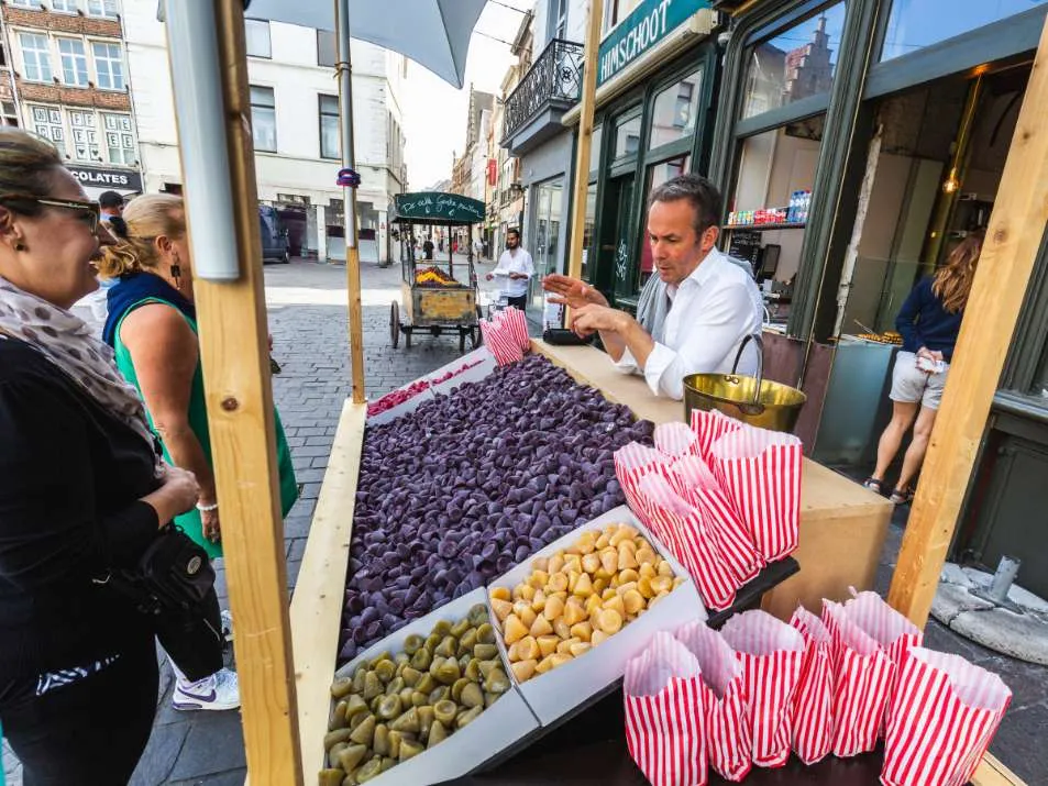 - Ik zou het zeker geen volledige lunch durven noemen (en ook veel te zoet daarvoor!), maar het zou flauw zijn om het niet in deze blog met tips voor Gent te zetten. Op elke markt en in elke winkelstraat kom je verkopers van Gentse Neuzekes of Cuberdons tegen. Het zijn kegelvormige zoete hapjes met een hart van gelatine en een harde buitenkant. De binnenkant heeft vaak een frambozensmaak, maar elke keer dat ik in Gent kom lijken er méér grappige, gekleurde en lekkere varianten in omloop te zijn. Koop dus een zakje en proef deze plaatselijke snack!